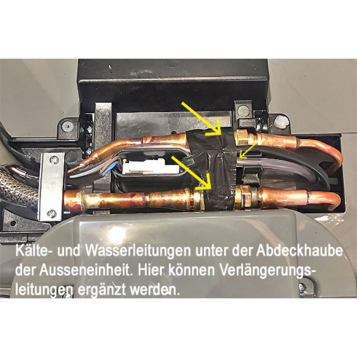 In dieser Verbindungsleitung liegen Kupferröhrchen mit Kühlmittel sowie der Wasserschlauch, welcher das Kondenswasser aus dem Rauminnern nach aussen leitet (wo es mit der Ventilation vernebelt wird). Wenn Sie die Leitung durch eine Wand legen oder verlängern möchten, muss die Ausseneinheit von der Leitung getrennt werden. Dieser Vorgang ist zwar mit etwas technischem Verständnis machbar (Anleitung im Lieferumfang enthalten). Im Zweifelsfall empfehlen wir Ihnen jedoch den Beizug eines Klima-Fachmannes, da bei nicht sachgemässer Arbeit Kühlmittel entweichen kann. Vor dem Abtrennen der Ausseneinheit sollte das Gerät ein paar Minuten in Betrieb sein, damit in der Leitung Druck aufgebaut wird und die Rückschlagventile bei der Trennung sauber schliessen. Bei Fragen oder Unsicherheit geben wir Ihnen gerne Auskünfte.