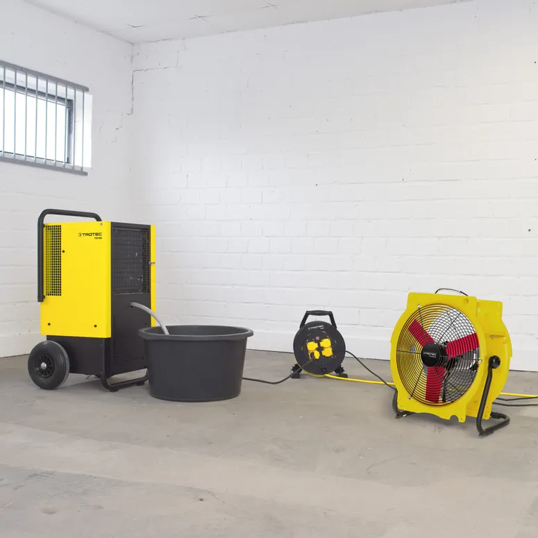 Ein Hochleistungsventilator für Bautrocknung, Trocknung von Wasserschäden oder auch für industriellen Einsatz. Stapelbar, Schlauchanschluss möglich.